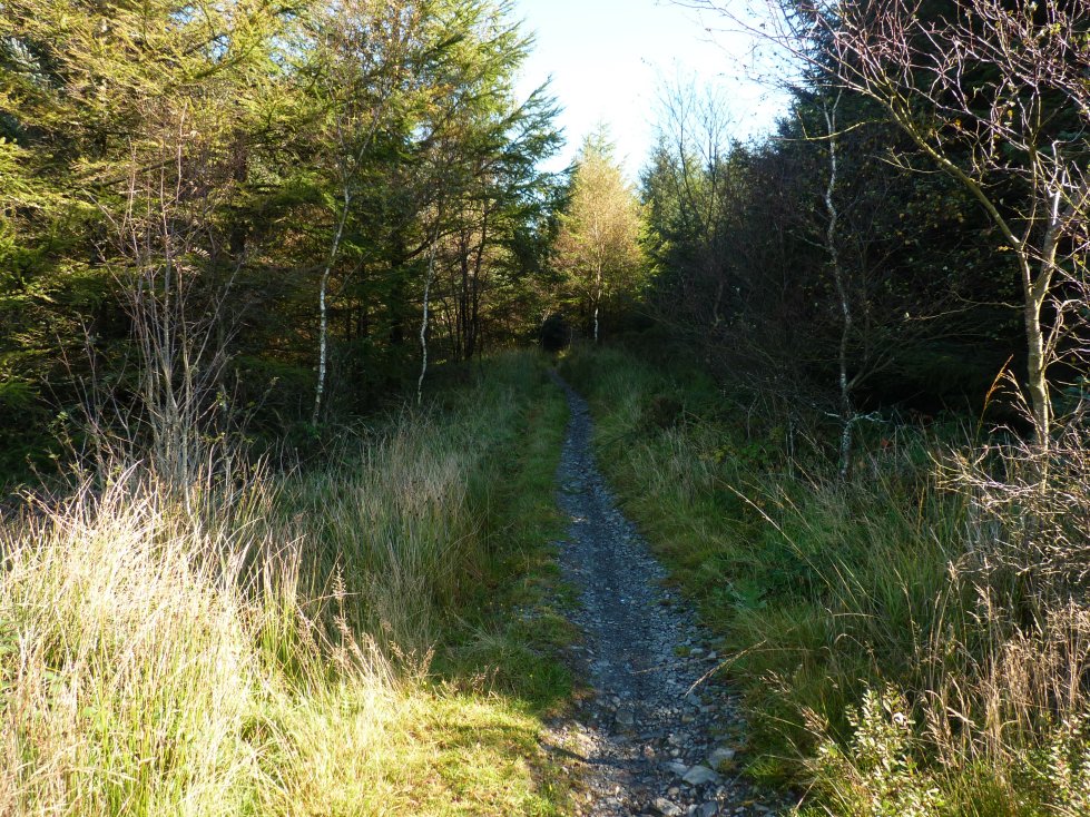 The narrow path through the trees eventually meets the wide forest tracks which cross the Grizedale plantations.