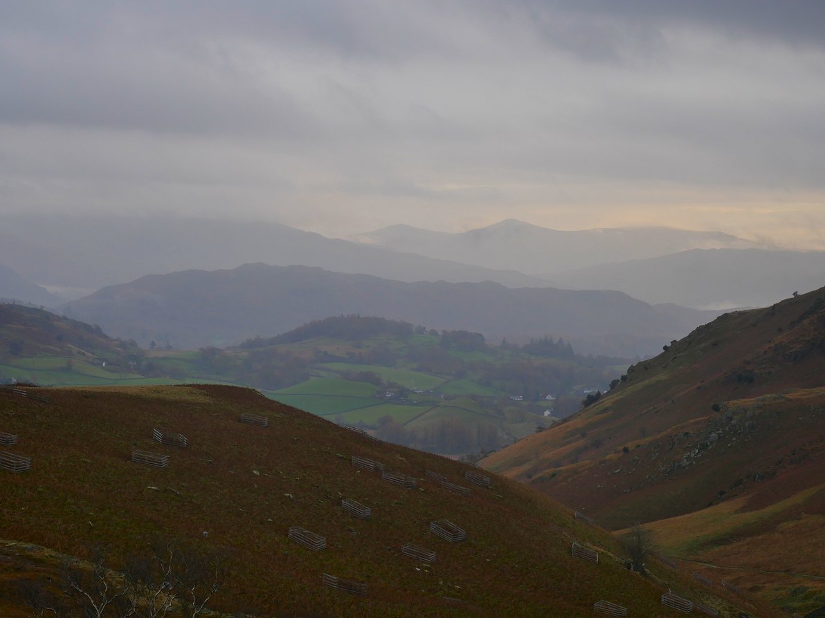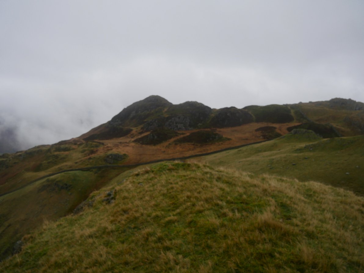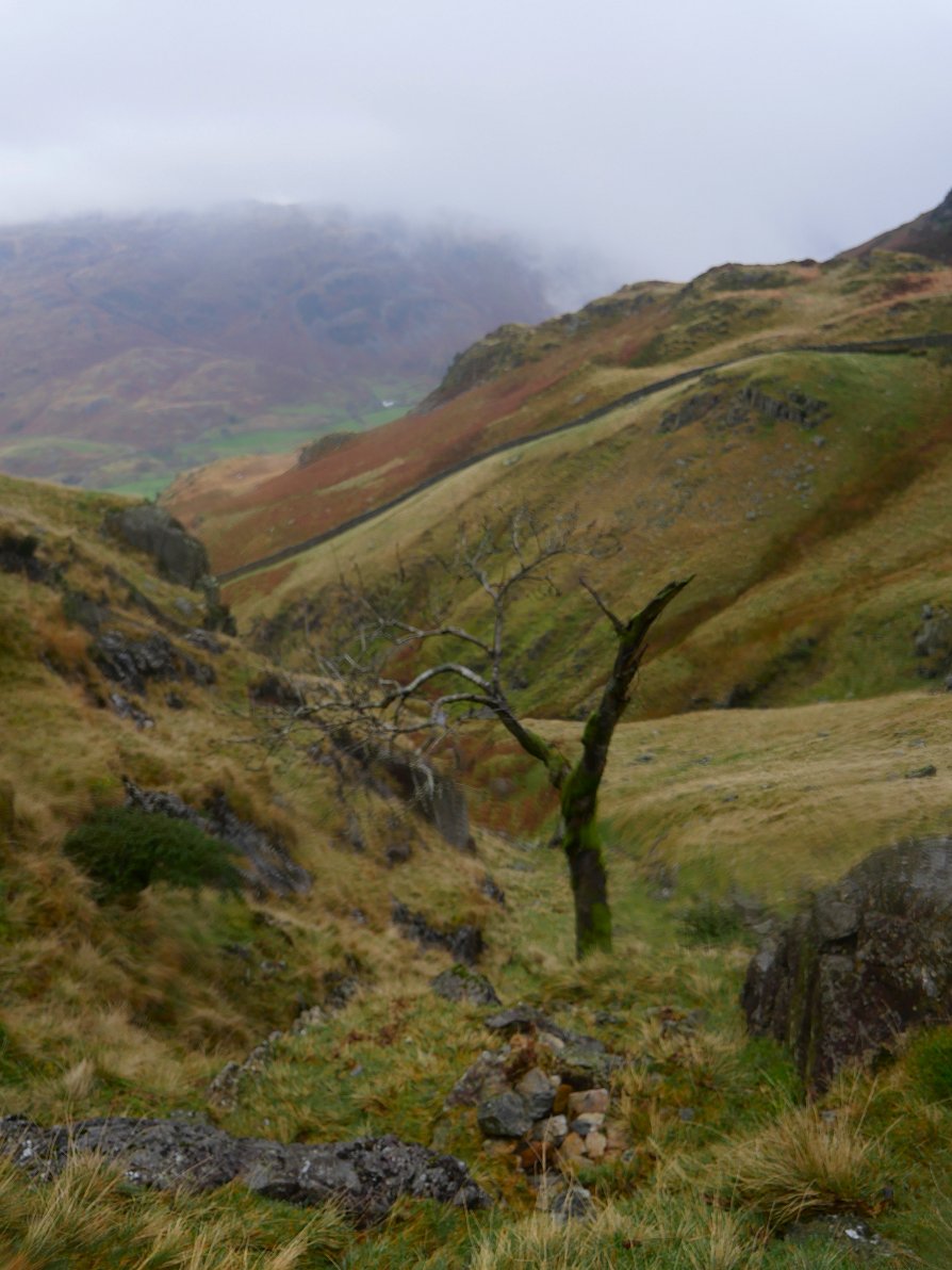 Looking back down the way I'd come. The Langdales have disappeared into the mist.