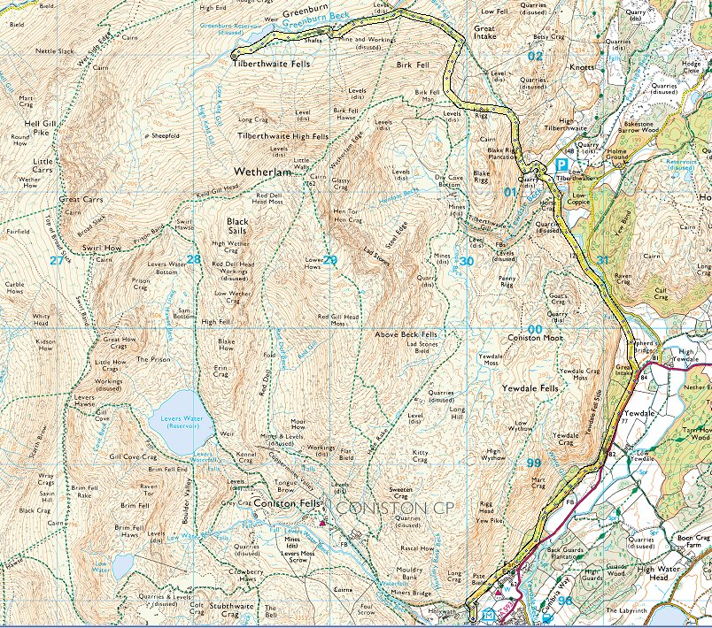 Great Intake. It was now raining quite hard so I decided to scrap the idea of Wetherlam and instead descend to the road at Tilberthwaite and walk back to Coniston that way.