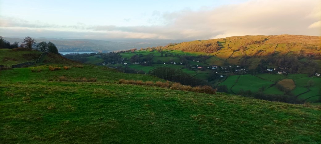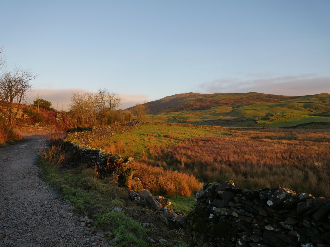 A tiny slice of Windermere is just visible and the sun is catching the hills above Troutbeck. It was about here that we climbed over a locked gate and started climbing the hillside towards Backstone Barrow.