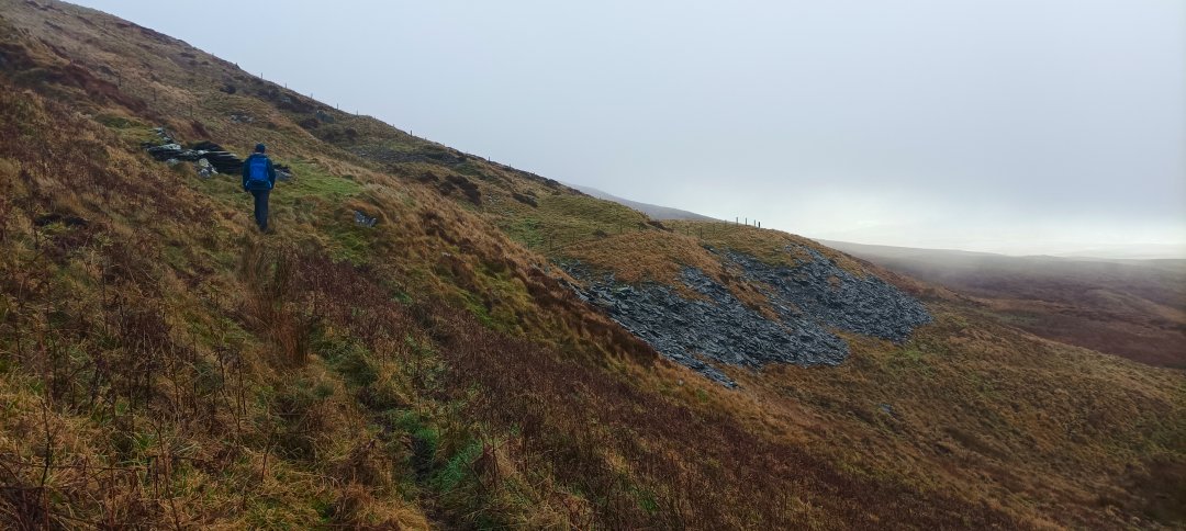Rather than drop down off the end of Sallows to reach the main path as I've done before we headed down to the quarry below Sallows shown on the map. If the weather had been clear we probably would just have made a bee line straight there but as we couldn't see anything we stuck to the path which loops back quite a way before turning towards the quarry. The quarry itself wasn't that interesting having only shallow workings but I was more interested to explore the track which headed down to the bridleway around Whiteside End