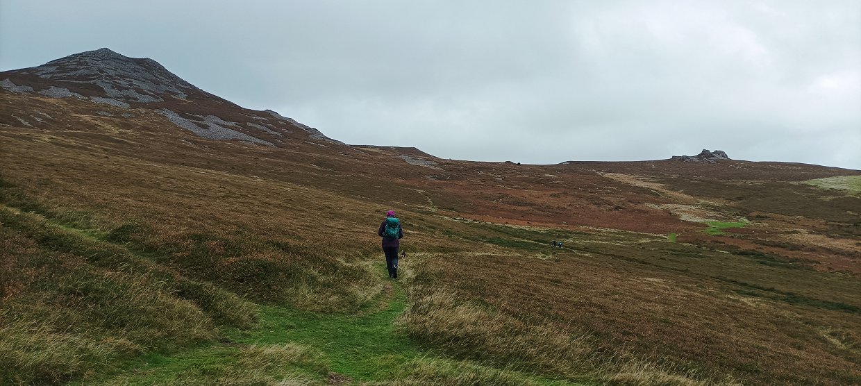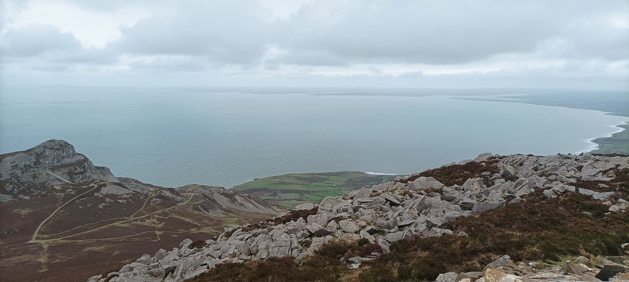 Looking back to the peninsula from Pen y Cil. The larger hill lit by the sun is Mynydd Rhiw, next along to the left is Carn Fadryn and just further to the left are the triple tops of the Yr Eifl hills which we are visiting later in the week.
