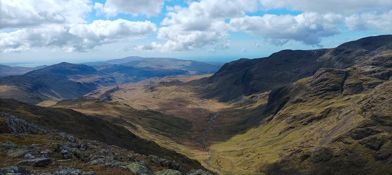 A look back down the climb Harter Fell is the dark hill and beyond that is the Irish sea and Black Combe.