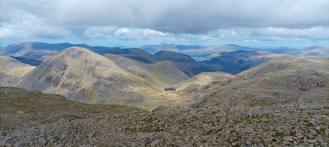 The view down to Damas Dubs, Silverybield Crag and the other lower fells in Upper Eskdale. Above them Harter Fell is unmistakable and to it's left are Border End and Hard Knott.