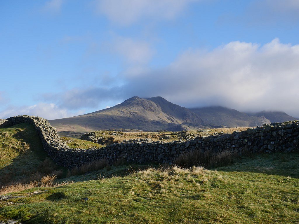 It's a bit of a shock to the system getting out from the car and into the very steep pull up Hard Knott pass especially as the temperature was forecast to be around freezing overnight so I was weighed down with my winter camping Kit. The climb through the Roman fort is not too bad though especially as you start get a view of the high fells. Slight Side is clear but Scafell and the Pike are in cloud but it was forecast to lift later in the day