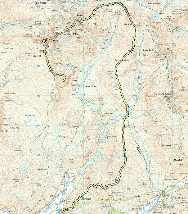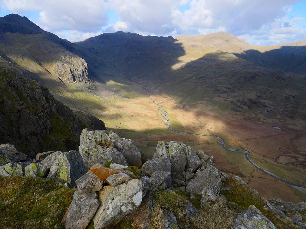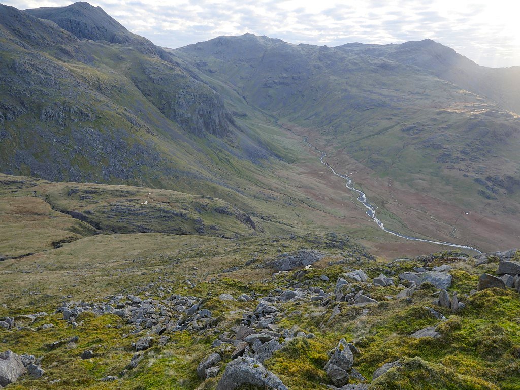 Lingcove Beck with Esk Pike above to the left and Bowfell to the right. I managed just about to find away across the beck without getting wet and started on the long but fantastic climb