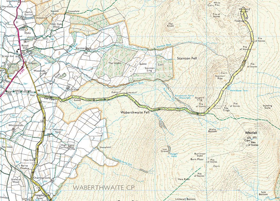After just under a mile and a half I arrive at Fell Lane which true to it's name heads straight for the fells. Most of the Stainton group of fells can be seen from Burn Moor on the right, Stainton Pike in the centre and Yoadcastle, Woodend Height, White Pike and the Knott on the left.