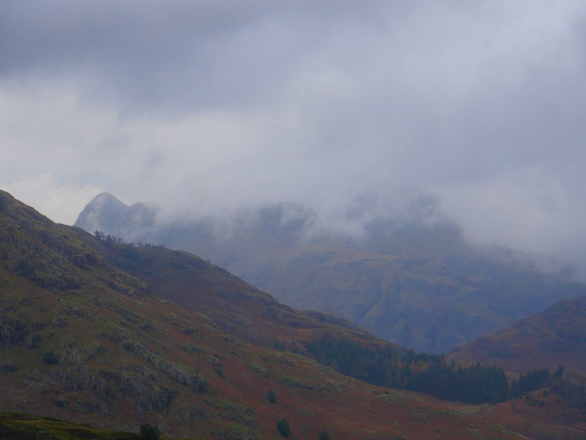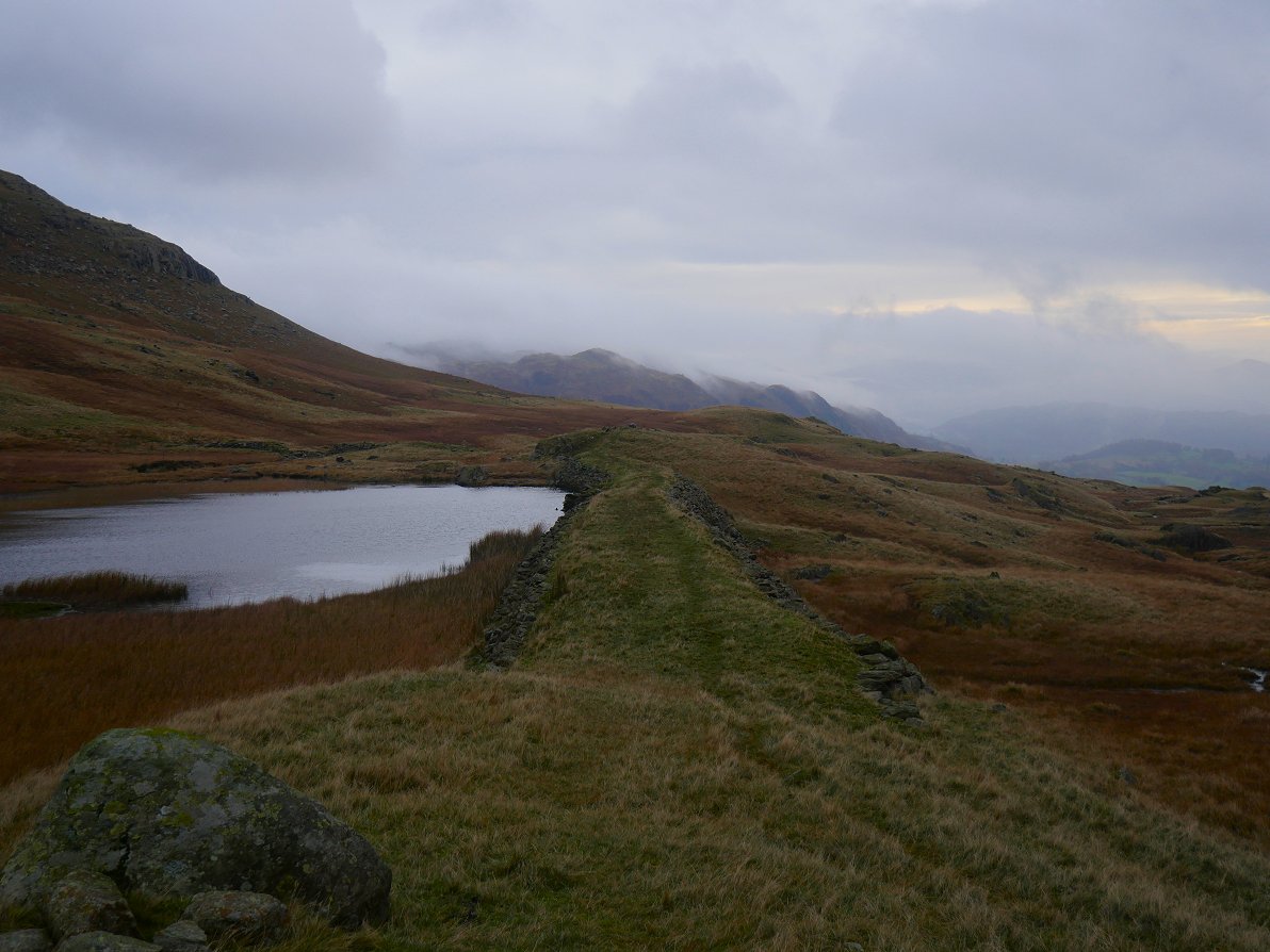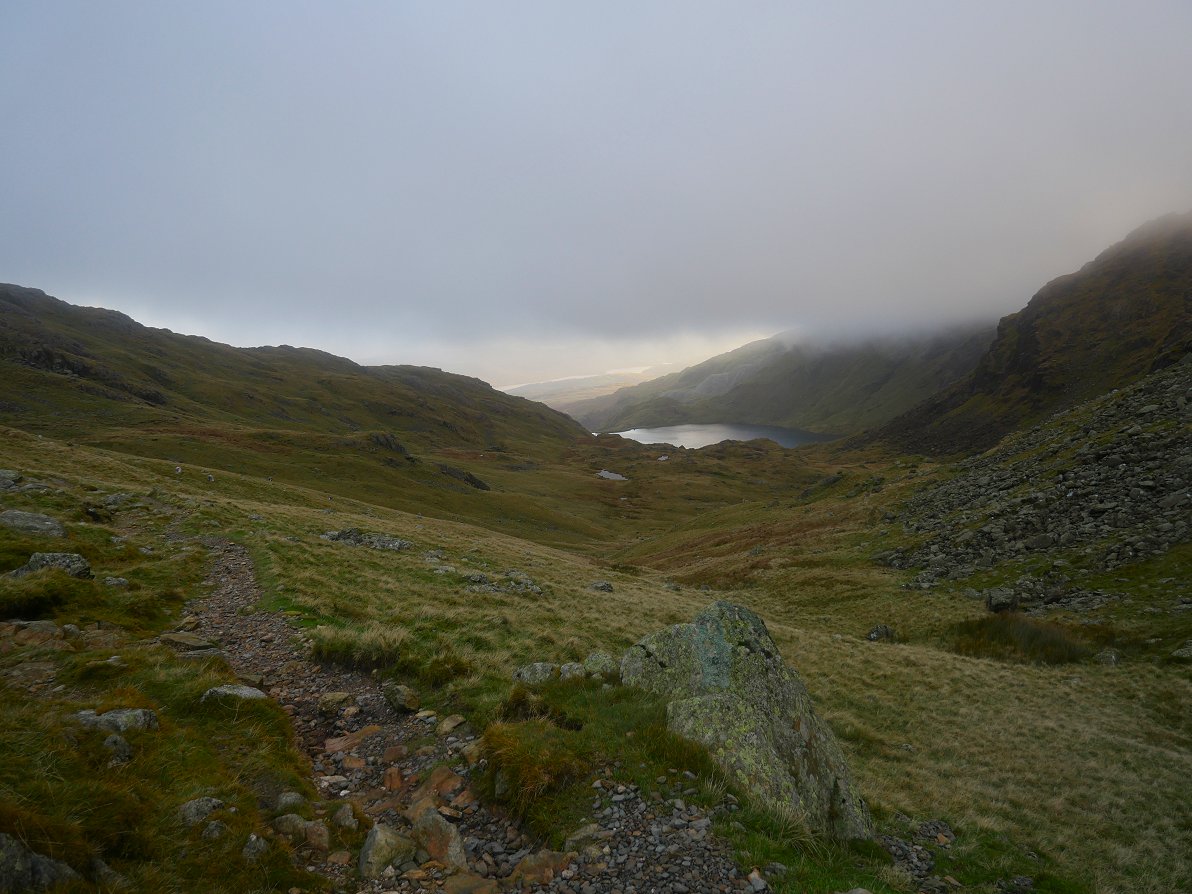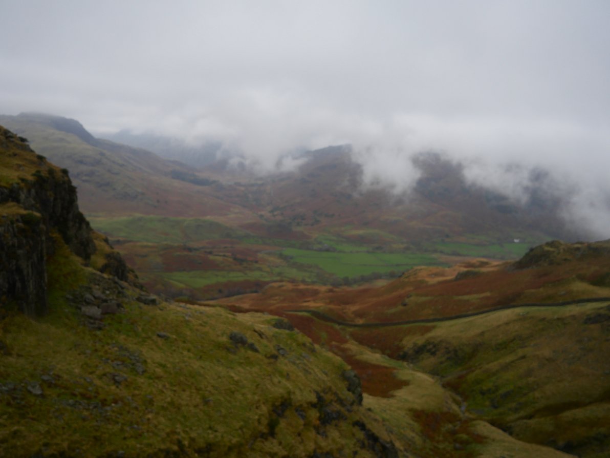 Looking back down the way I'd come. The Langdales have disappeared into the mist.