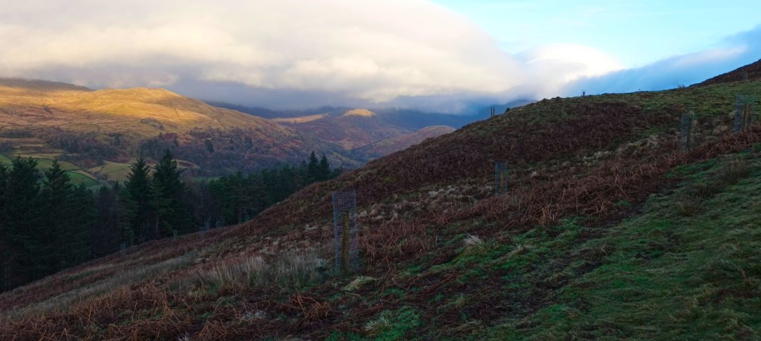 A tiny slice of Windermere is just visible and the sun is catching the hills above Troutbeck. It was about here that we climbed over a locked gate and started climbing the hillside towards Backstone Barrow.