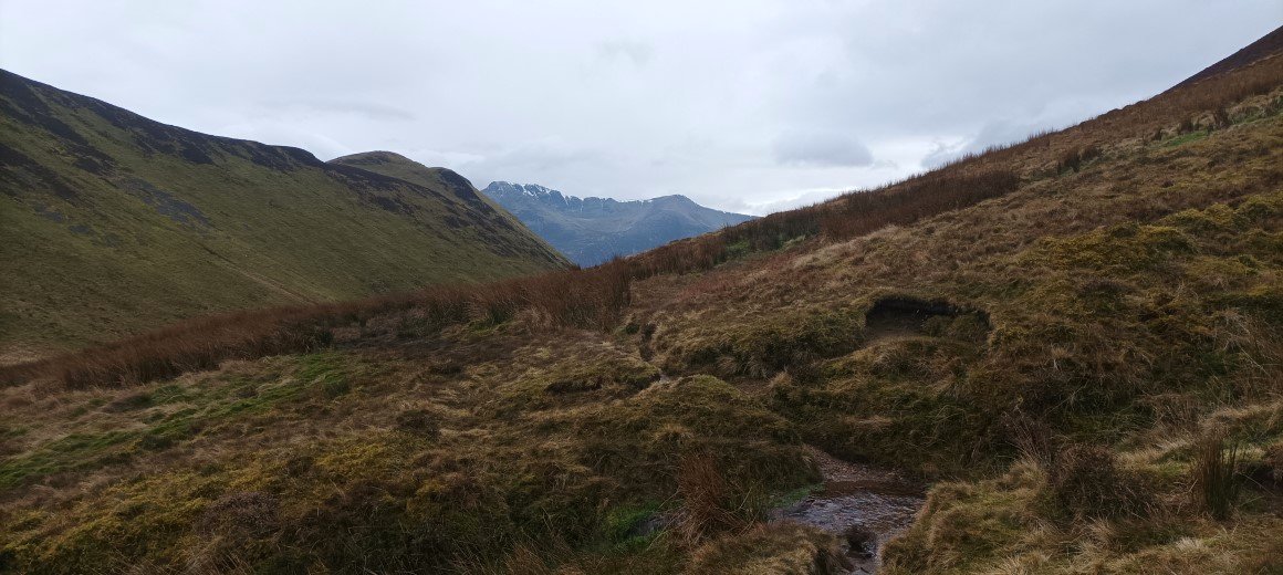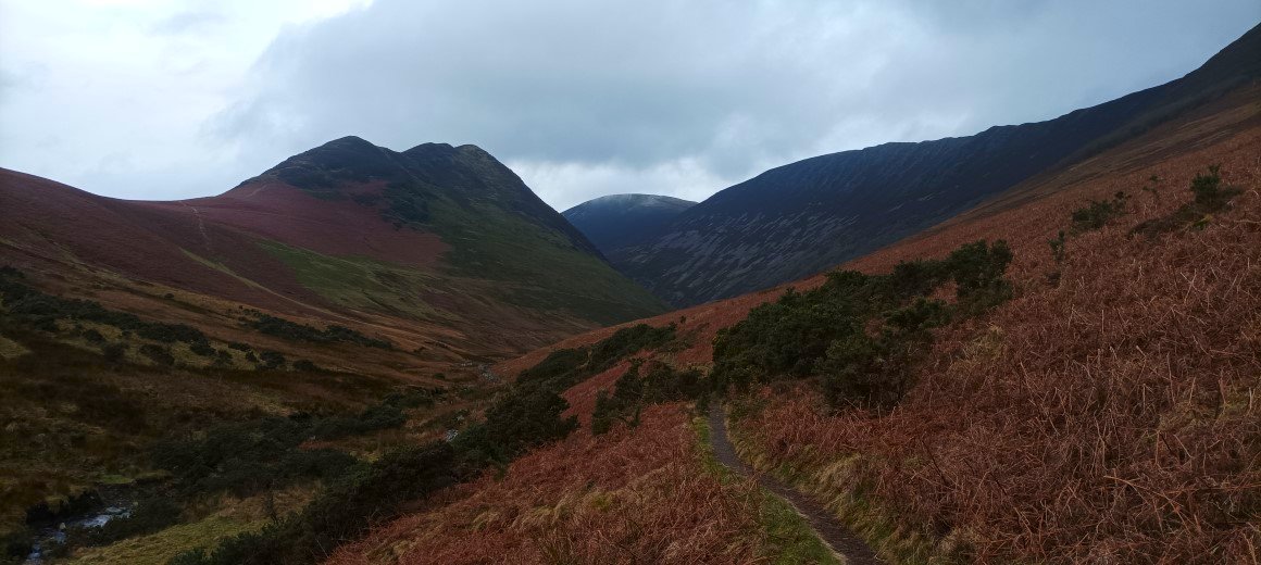 Looking down to the valley of Rigg Beck with Ard Crags above to the left and Scar Crags above to the right.