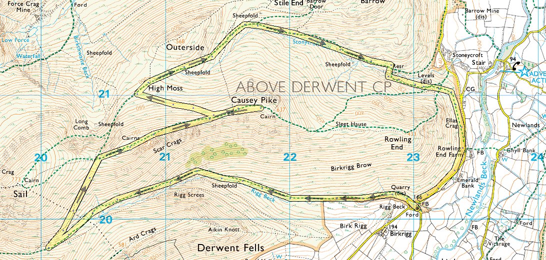 Route 18th - Rigg Beck Quarry - Rigg Beck - Rigg Screes - Scar Crags - Causey Pike - High Moss- Stonycroft mine road - Rigg Beck Quarry- ( About 6 miles 1900ft of ascent )