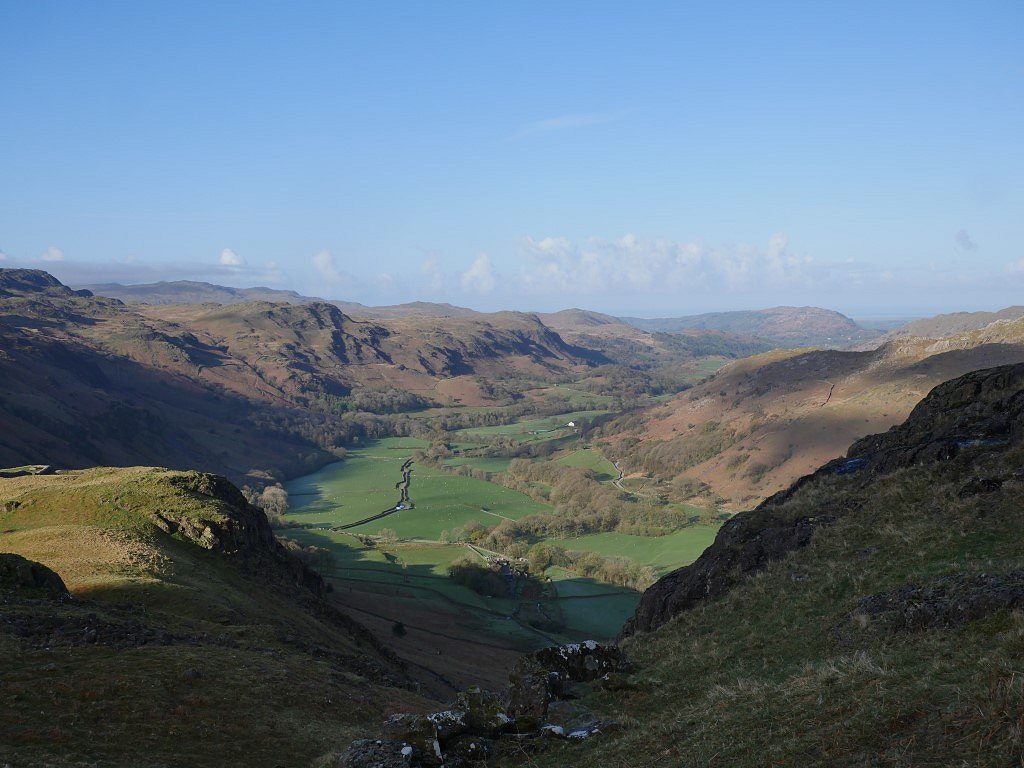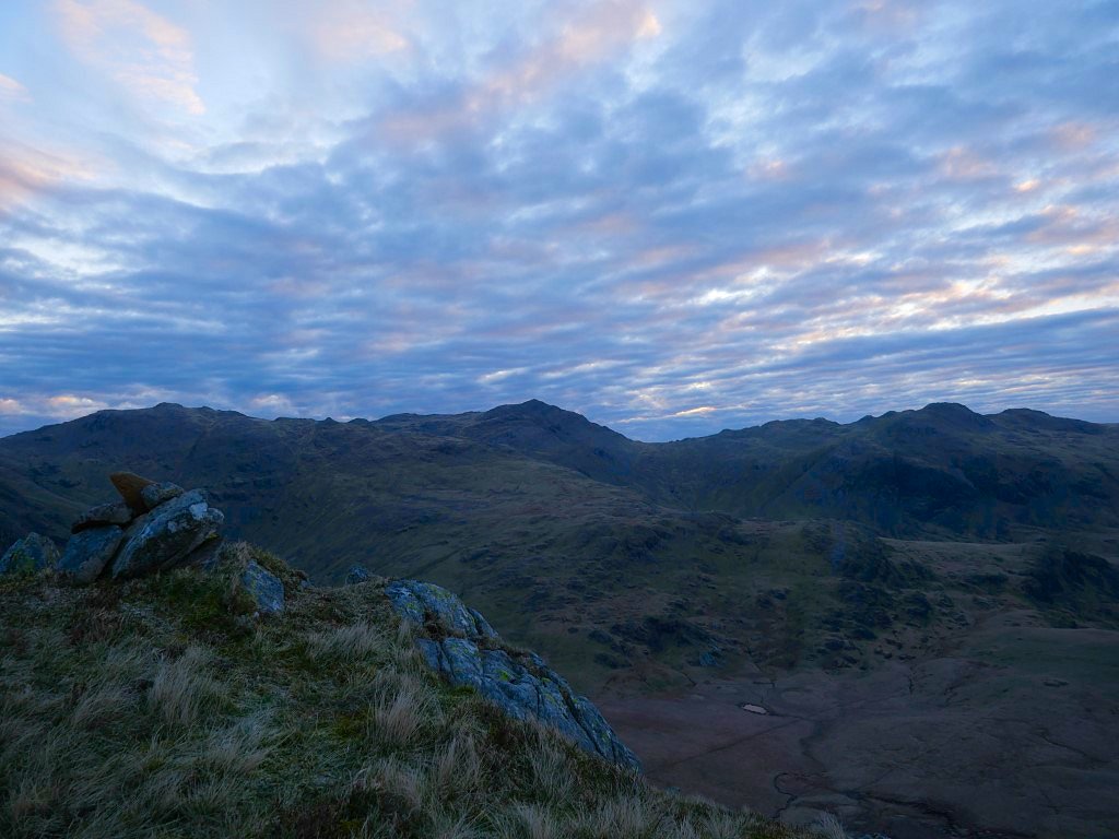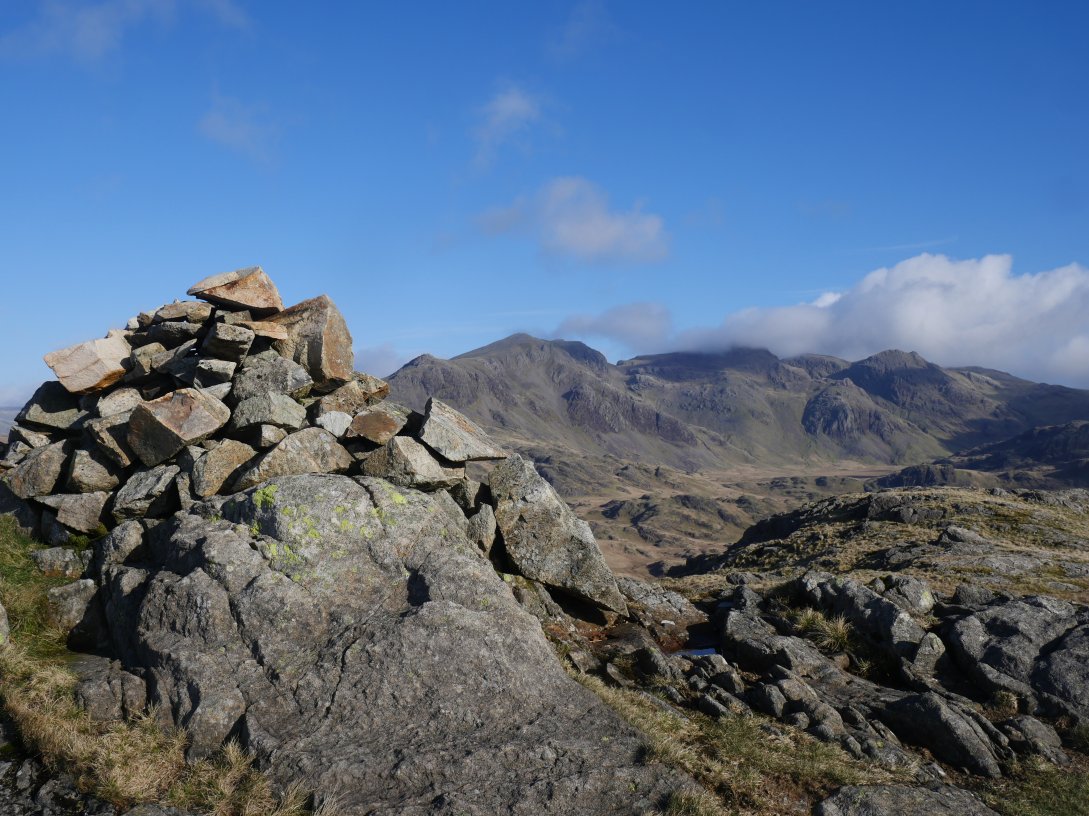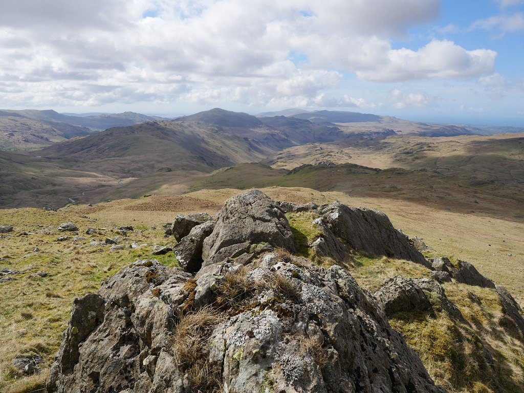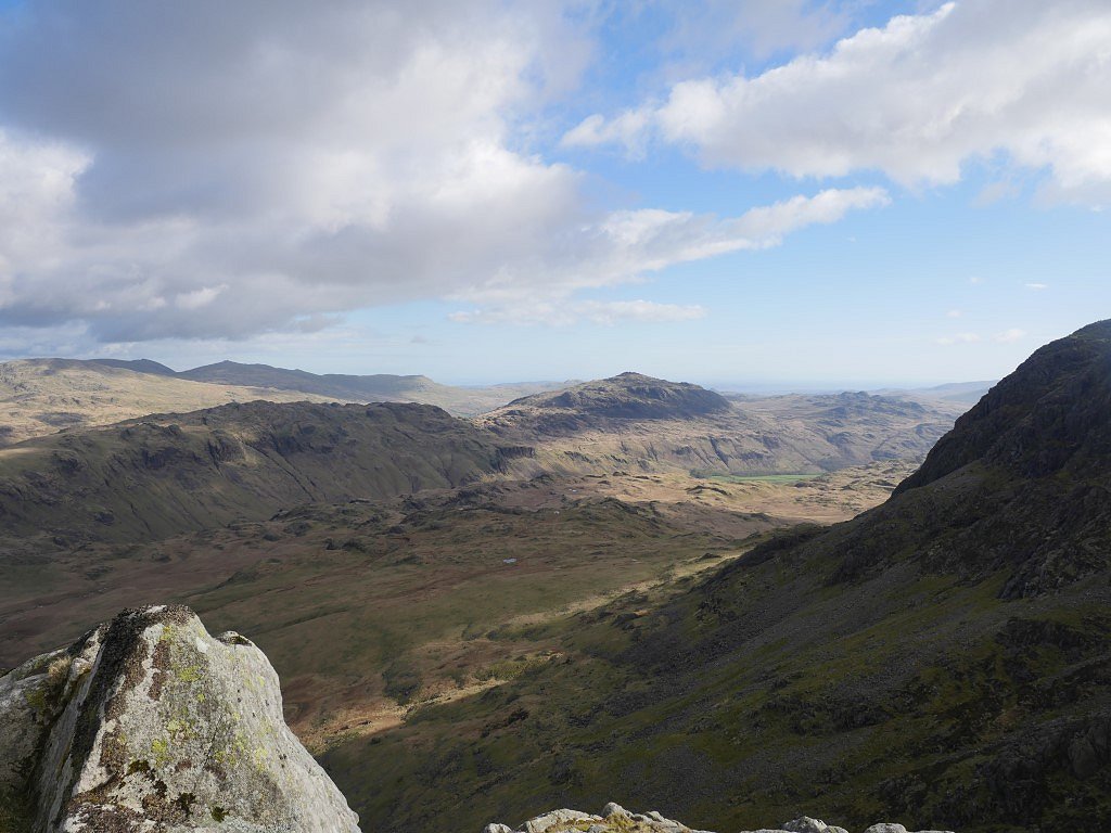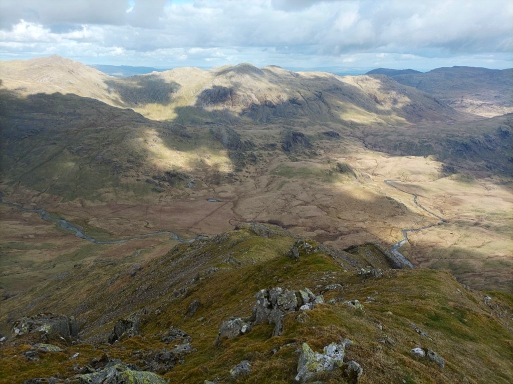 The view down to Damas Dubs, Silverybield Crag and the other lower fells in Upper Eskdale. Above them Harter Fell is unmistakable and to it's left are Border End and Hard Knott.