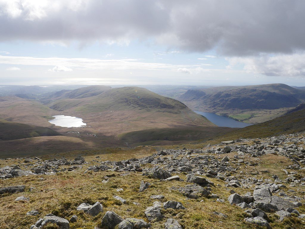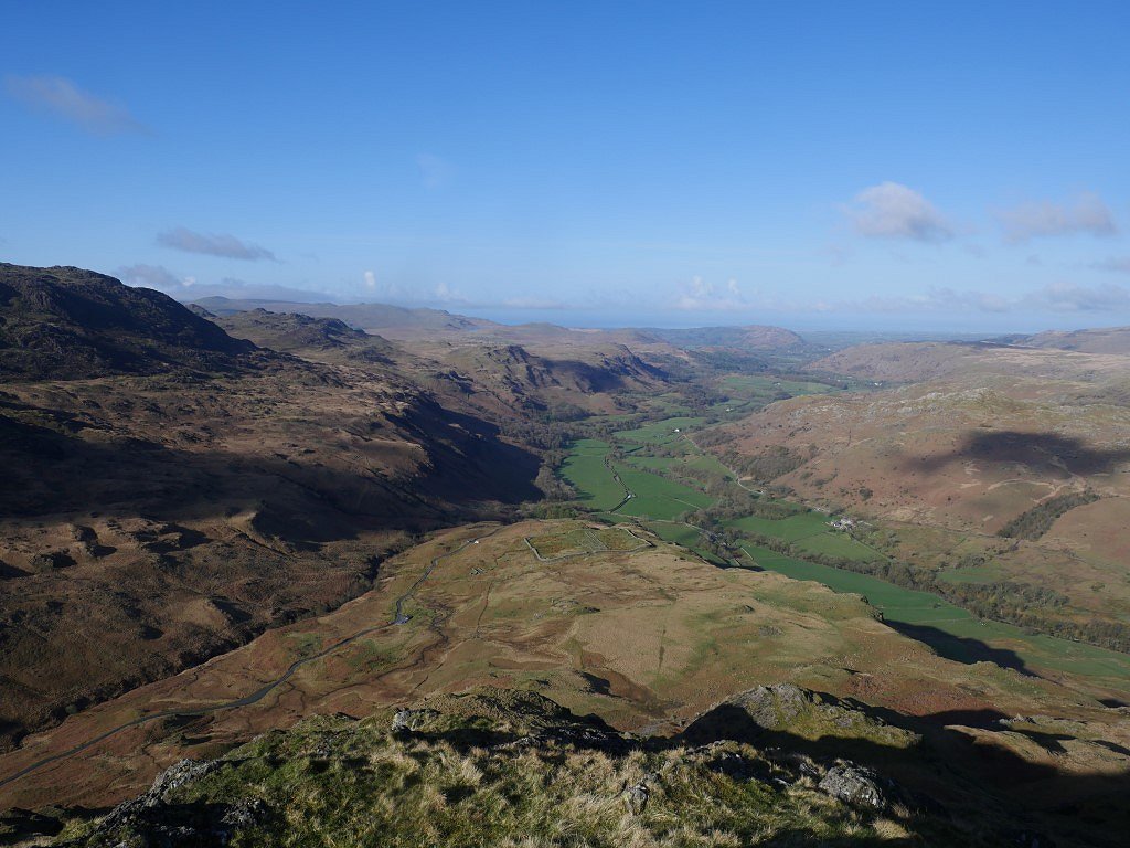 A look back down the climb Harter Fell is the dark hill and beyond that is the Irish sea and Black Combe.