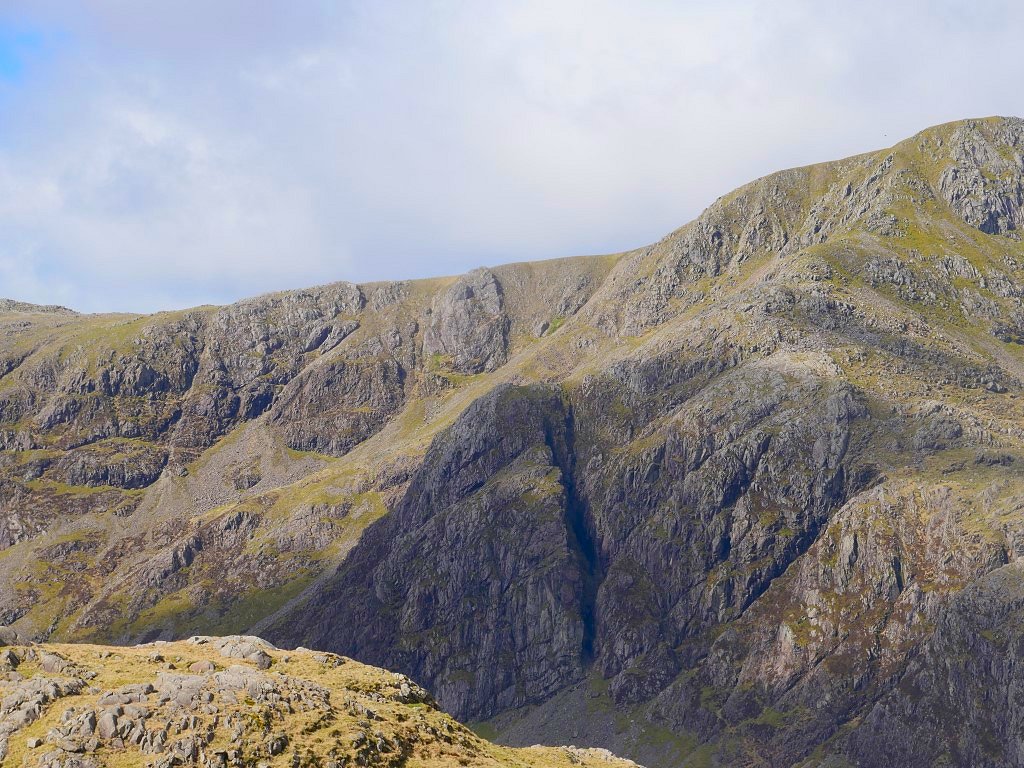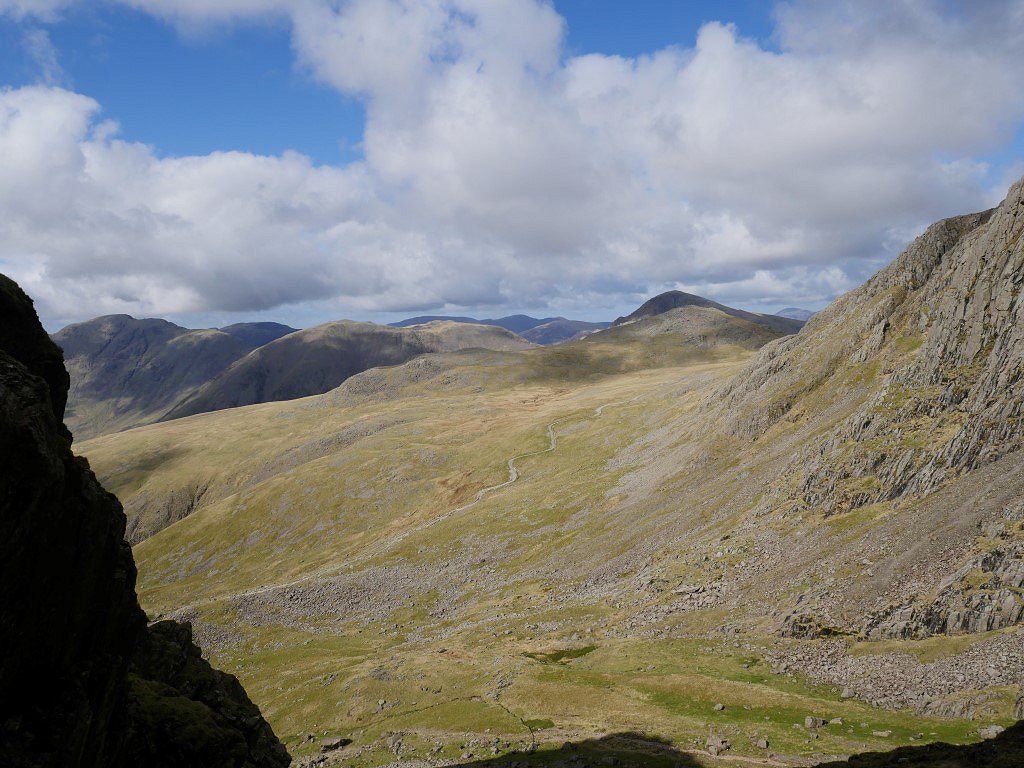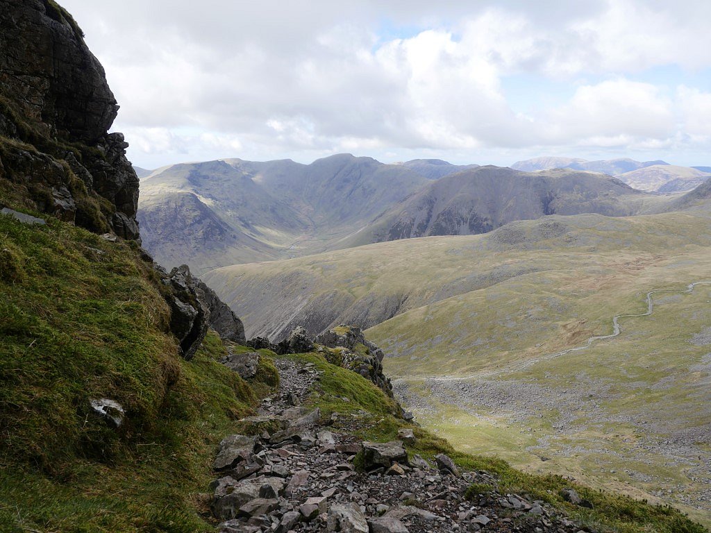 From the narrow exposed path you get a great view of Mosedale with the fells around it which , from the left are Stirrup Crag on Yewbarrow then Red PIke, Scoat Fell, Pillar and Kirk Fell.