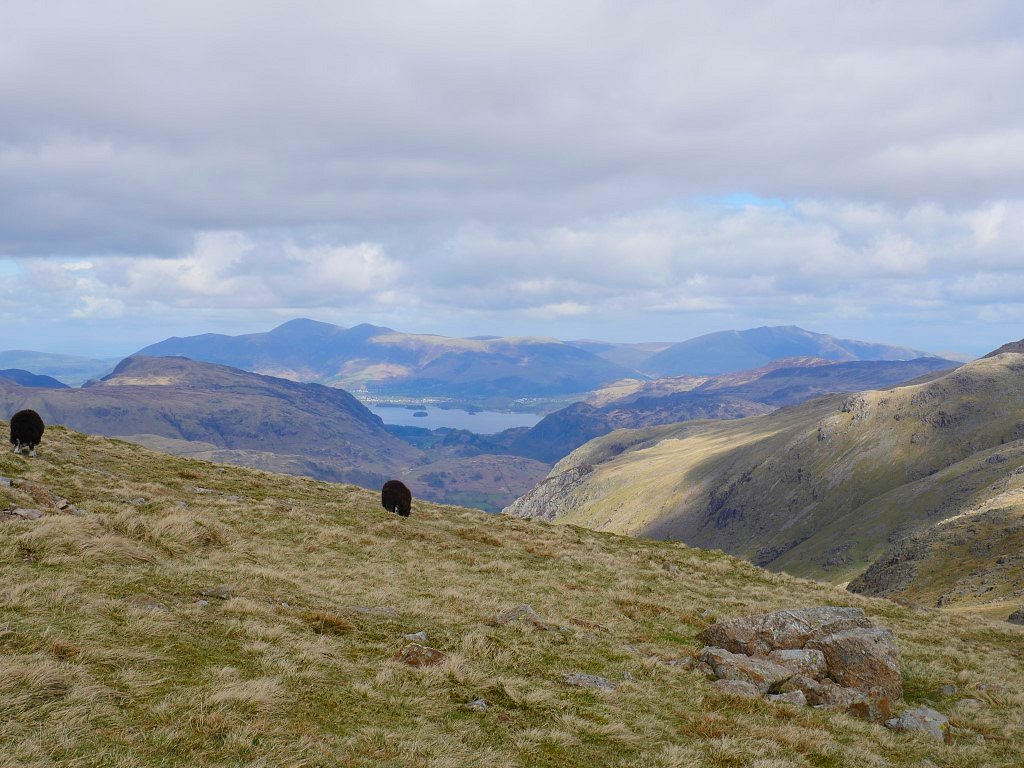 Rather than tackle the steep slopes leading directly to the summit area of Esk Pike I swerved to the right to meet the path coming up from Ore Gap and for the first time today got a view northwards to Derwentwater, Skiddaw and Blencathra.
