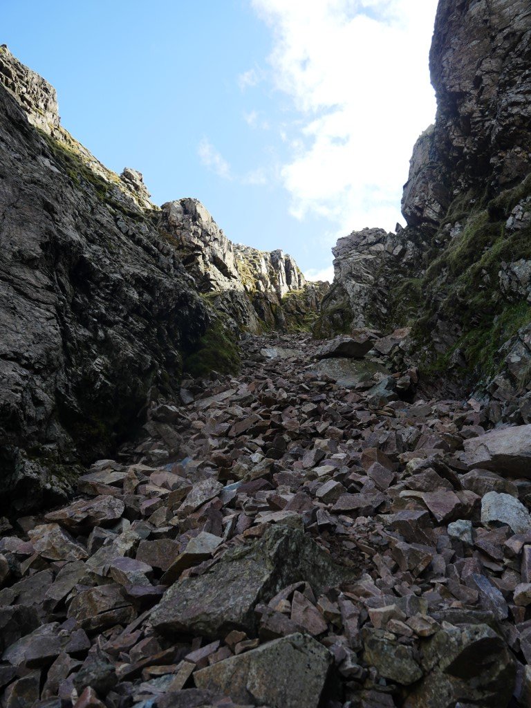 The final rocky scramble up out of a cold and windy Deep Gill to the sun.