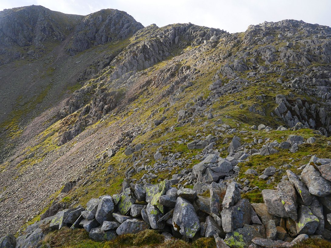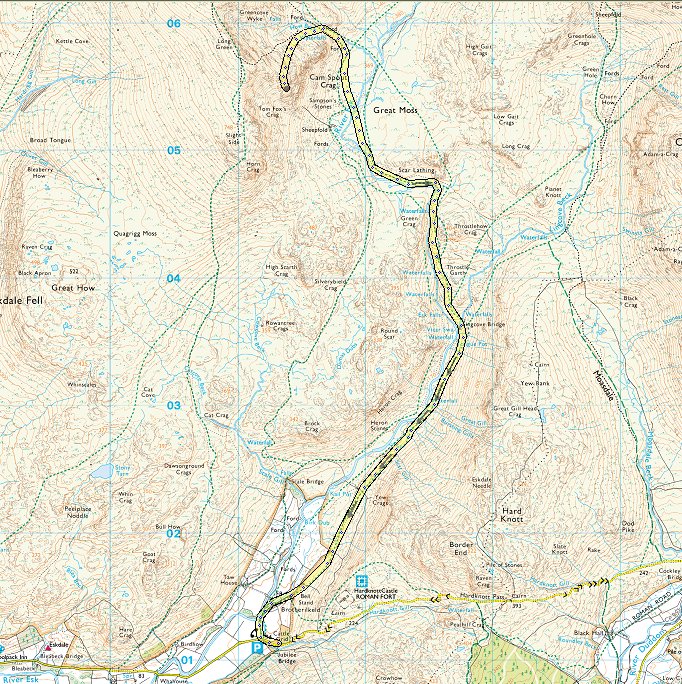 The Cam Spout ridge drops down from Long Green. The 676M top of Cam Spout Crag where I hope to camp is the lower top to the right. If when I get there there isn't a suitable spot I have a couple of reserve pitches which I noted when I climbed up here before.