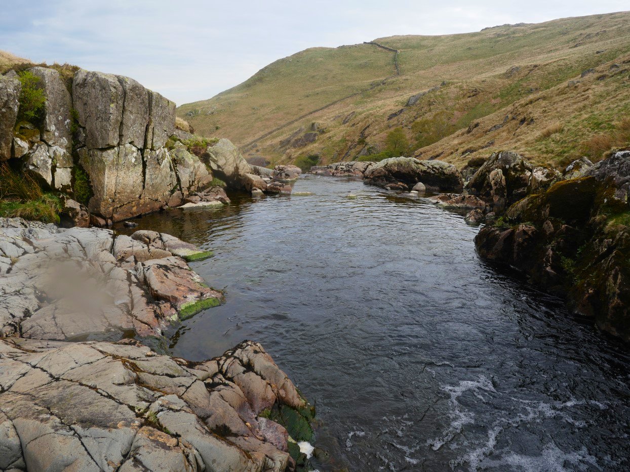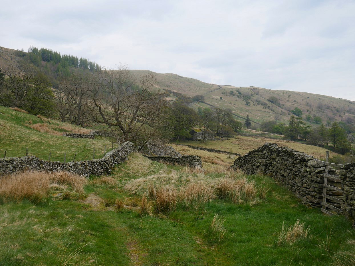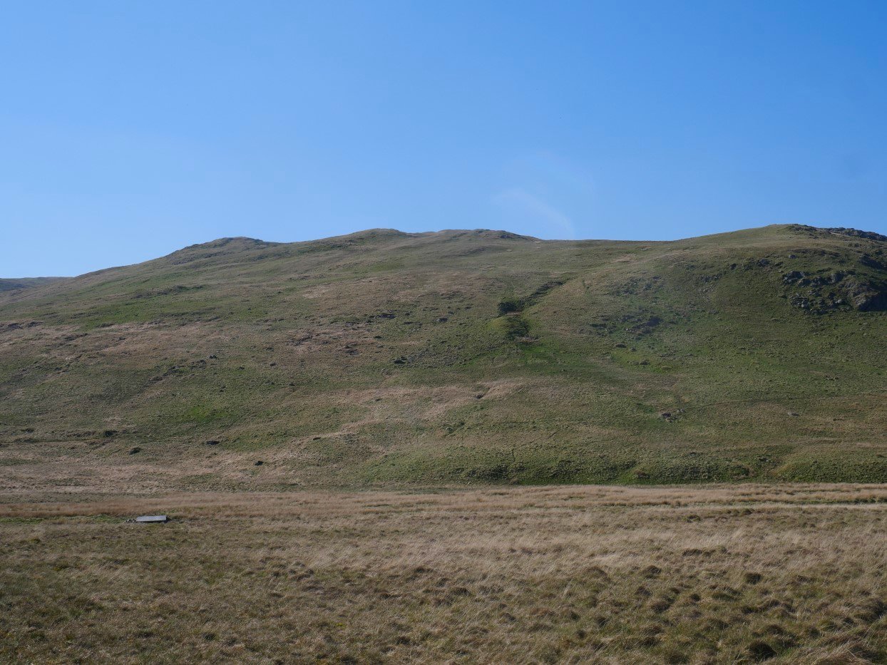 The path descends to Mosedale Beck and the concrete bridge over it. My route up to the tarn is straight up the fellside through the stream gully in the centre of the photo.