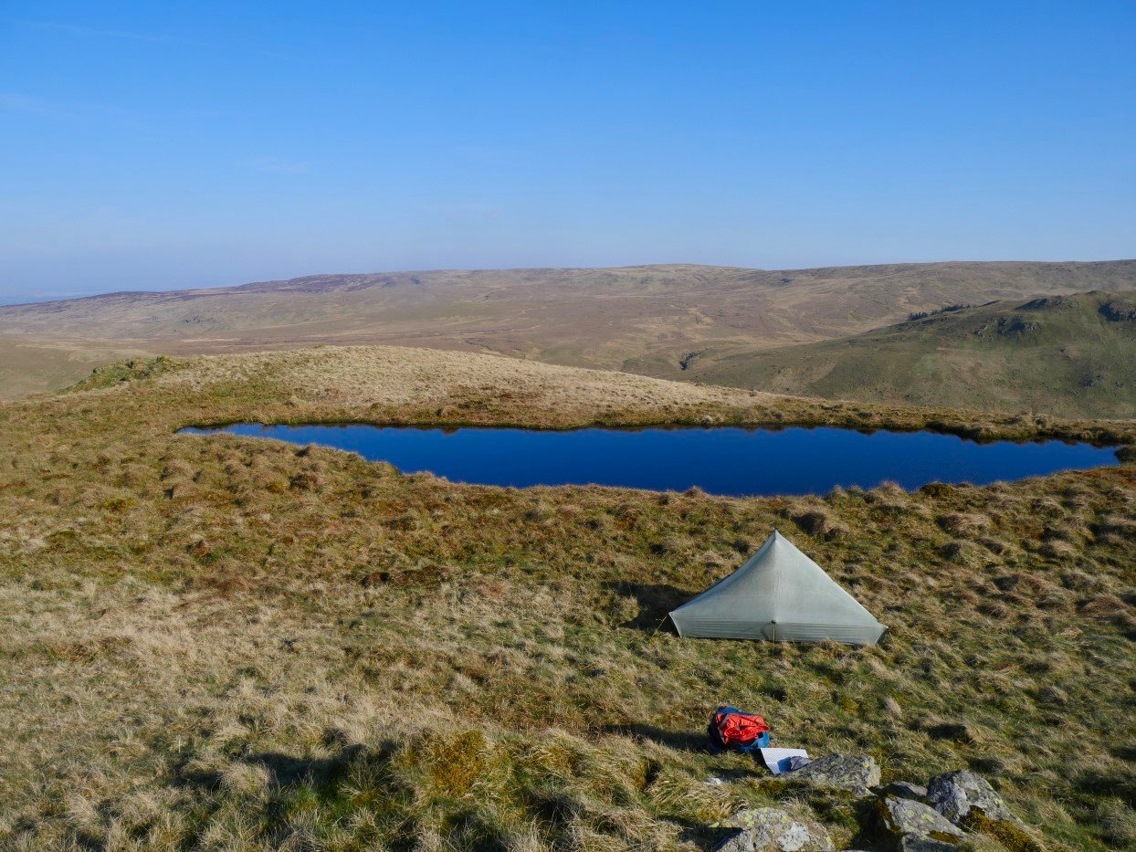 It was still early when I arrived so I lazed about in the sun reading my book and having a brew. Later in the afternoon a slightly chilly wind got up so I pitched the tent for a bit of Shelter. The tarn is probably one of hundreds in the Lakes and there are no really dramatic views from it but ever since I discovered it a few years ago I really like it and on a sunny weekend I knew that this is one place where I was virtually guaranteed a peaceful camp and I had not passed any other walkers only seeing a couple of people on distant tops.